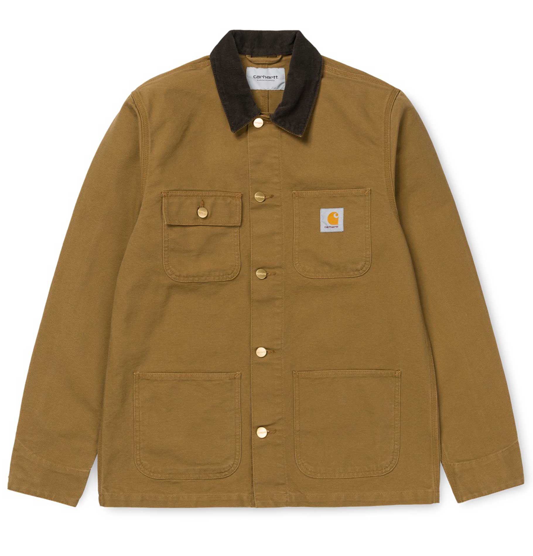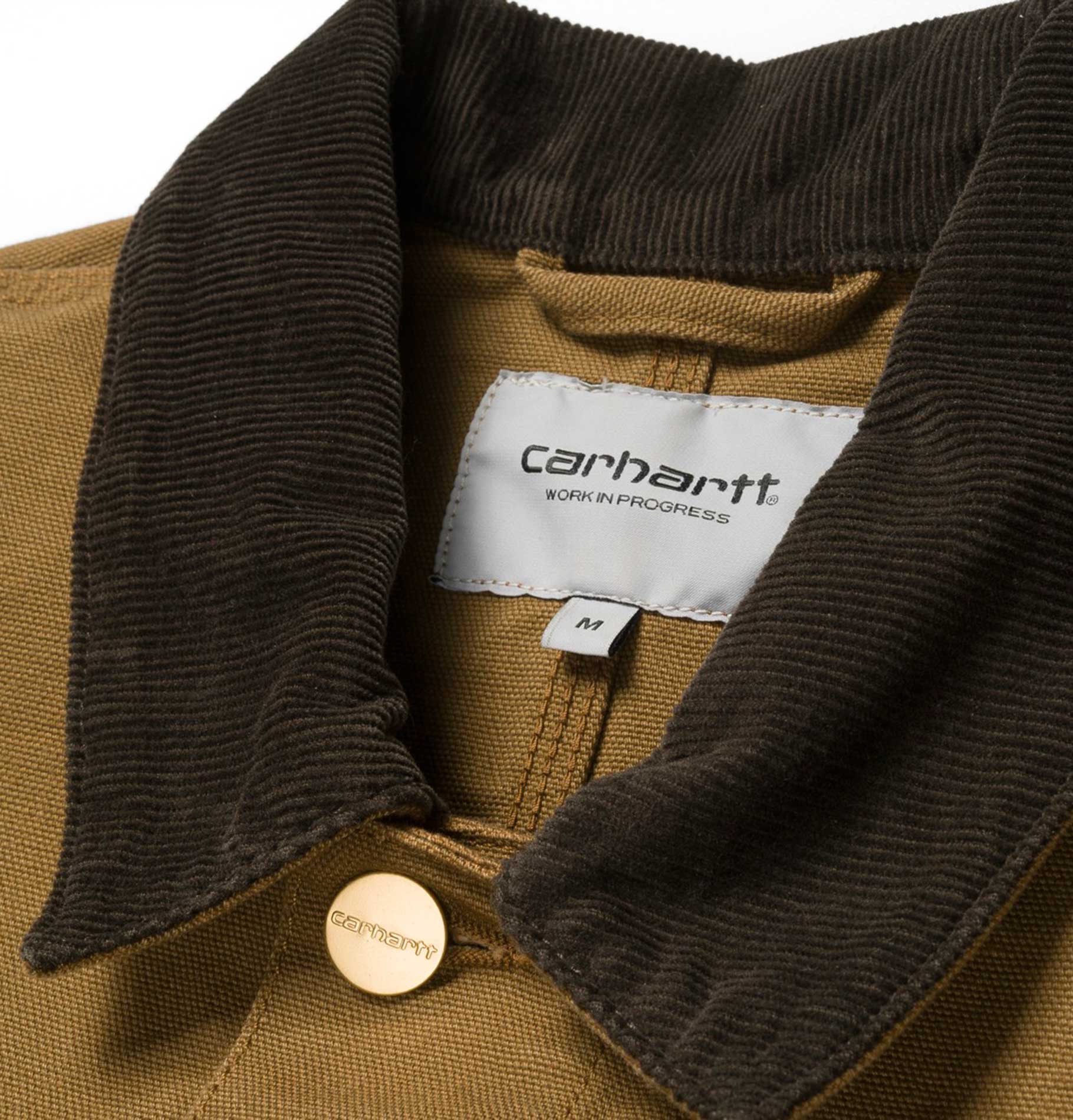 Carhartt Work in Progress's classic Michigan Chore coat has a workwear style with a durable "Dearborn" 12 oz canvas and a corduroy collar.