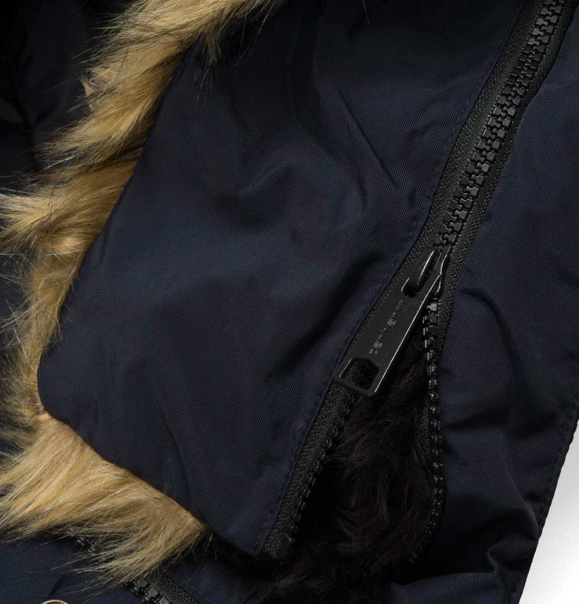 • Adjustable hood with removable faux fur and faux fur lining