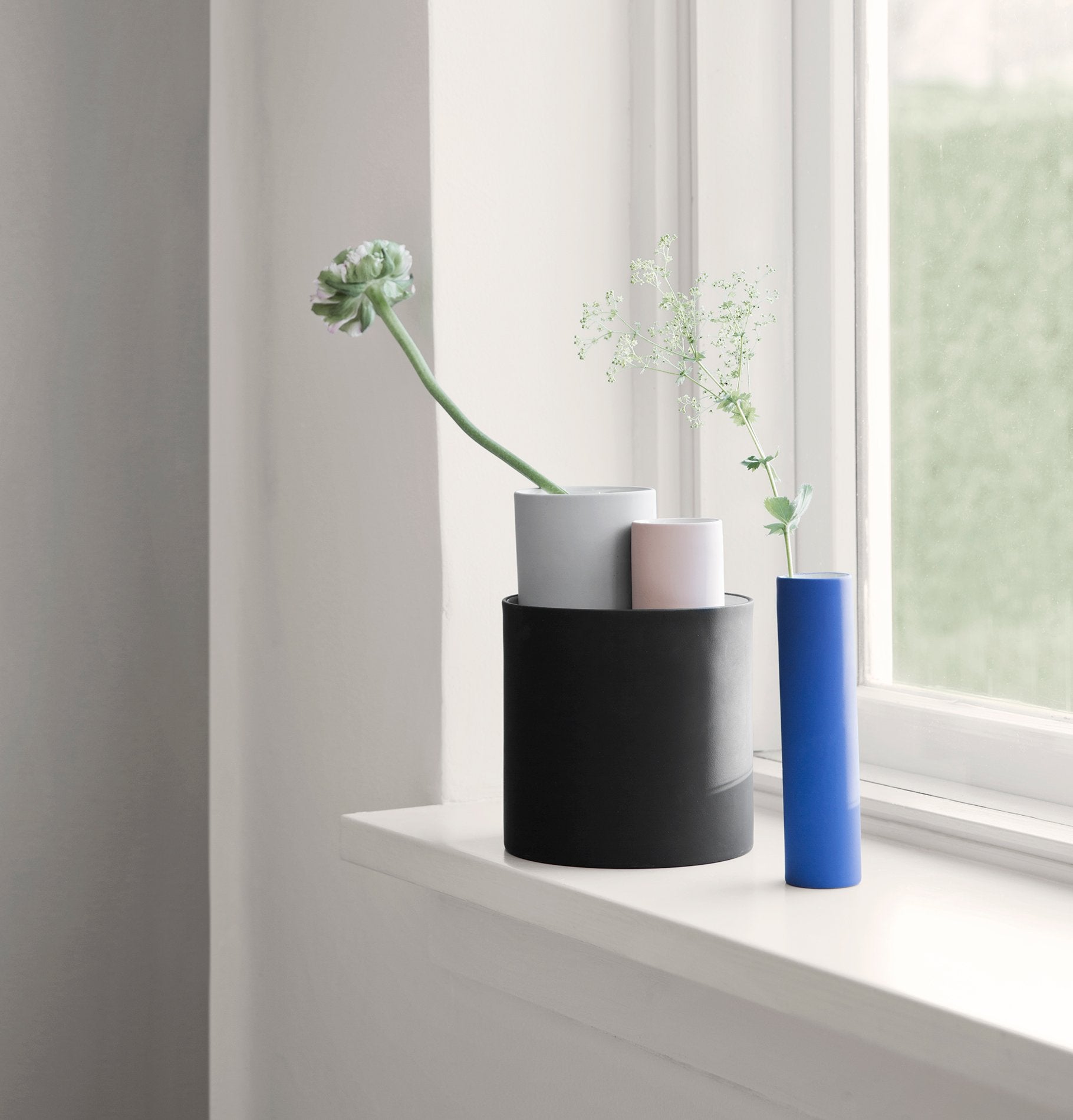 Arrange your flowers with style in our collect vases. Use the vases one by one or use them together as a modern object. The vases are made of ceramic with soft rubber paint in beautiful colours.