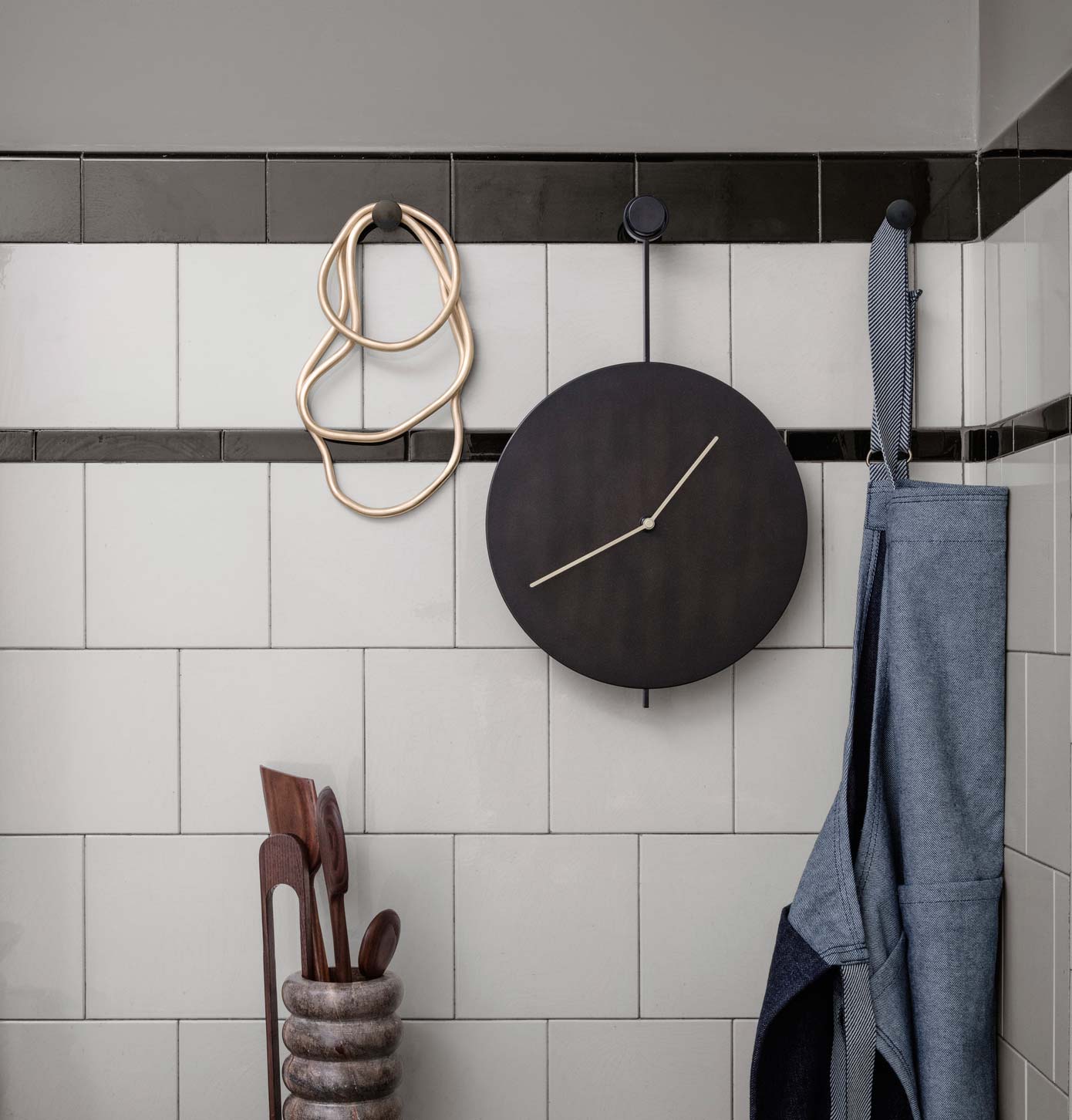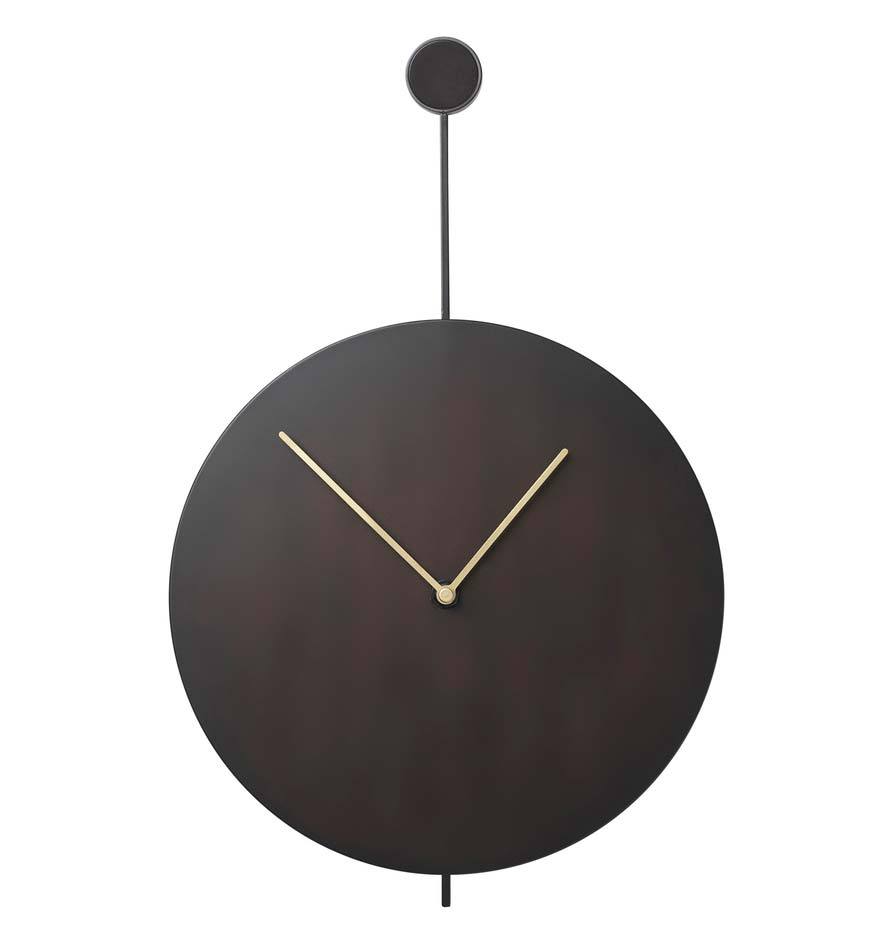 Clean lines define this modern and elegant wall clock made to be a fine accessory in your home. The brass hands stand out on the background of blackened steel and form a delicate expression. A simplistic approach to the essentials of a clock, it doesn't have second hands or numbers – only the constant, barely noticeable movements of the two hands reflects the trace of time.